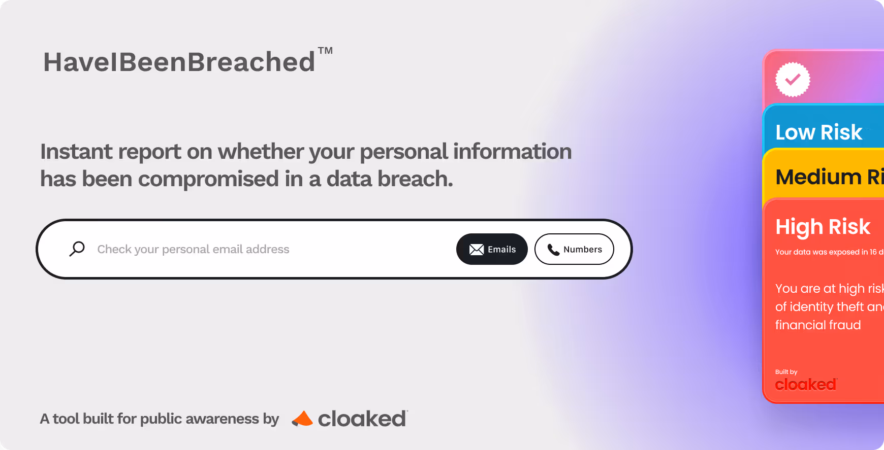 Introducing HaveIBeenBreached, Cloaked’s newest tool, which scans the public domain for your email or phone number to see if your information has been included in a data breach. Chances are, it has. The widget then outlines exactly where and when your data became vulnerable, and assesses your risk for identity theft and/or fraud.