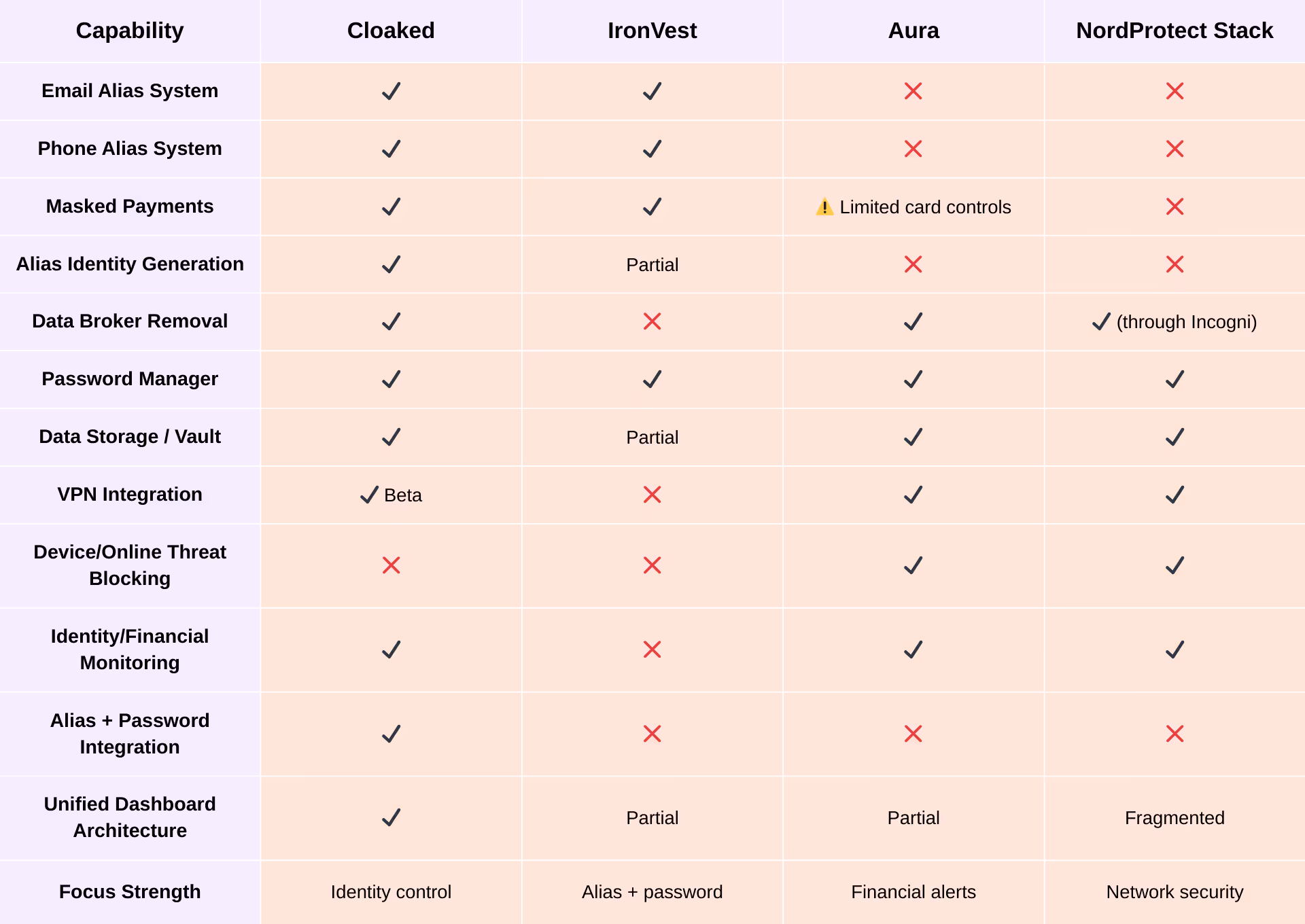 IronVest focuses mainly on masked payments and email aliases for shopping and form protection. While effective for eCommerce privacy, it offers limited phone aliasing and weaker multi-identity separation compared to Cloaked.
